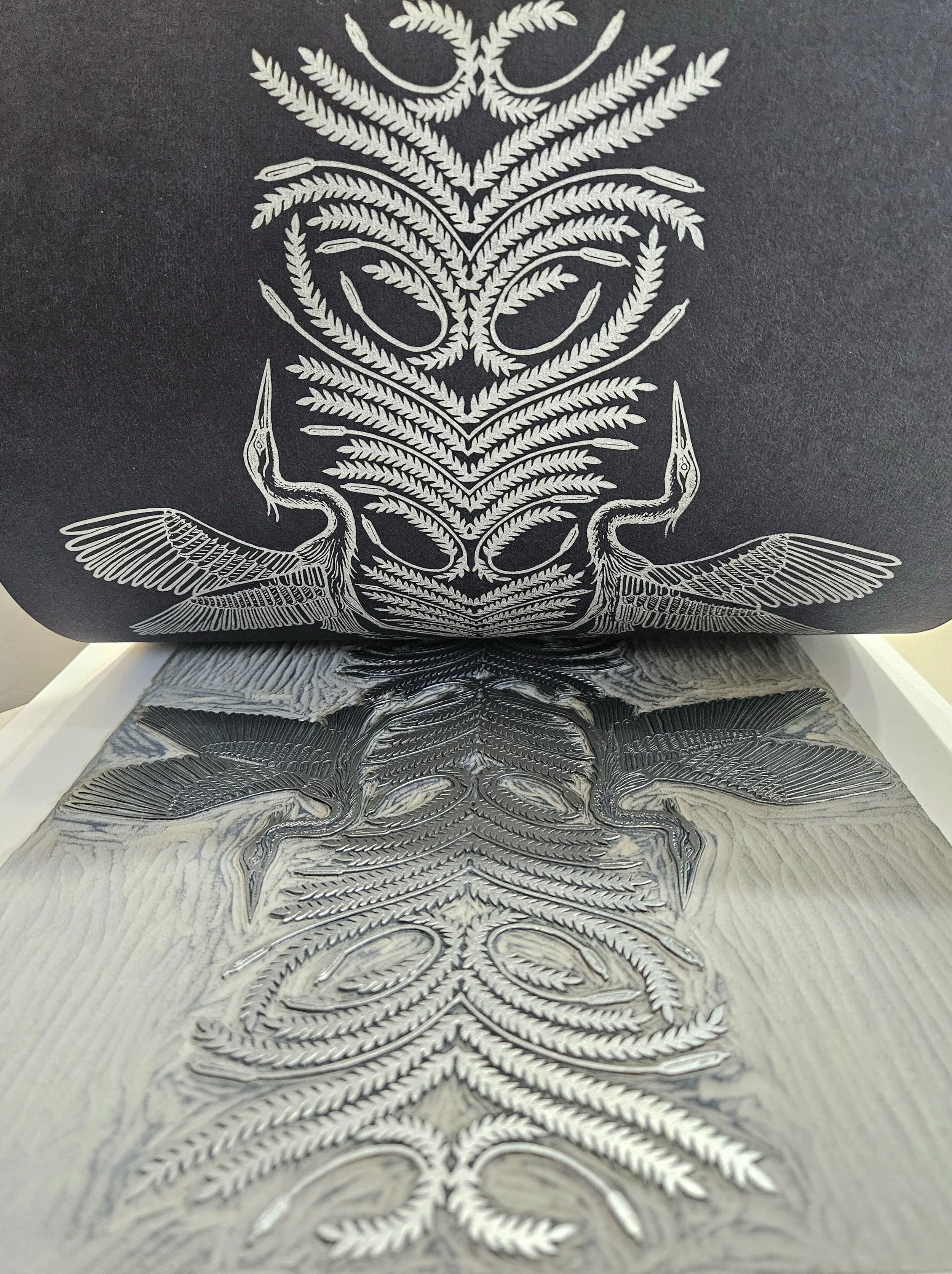 All designs are created from the manual process of block printing. The design starts on paper, gets carved onto a linoleum block, inked up, then pressed to transfer the design onto paper and textiles. Each print is a handcrafted original with small differences in color or texture that reflect the unique beauty of block prints.